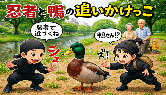 川と陸を行ったり来たりする鴨、忍者ごっこで追いかける双子。